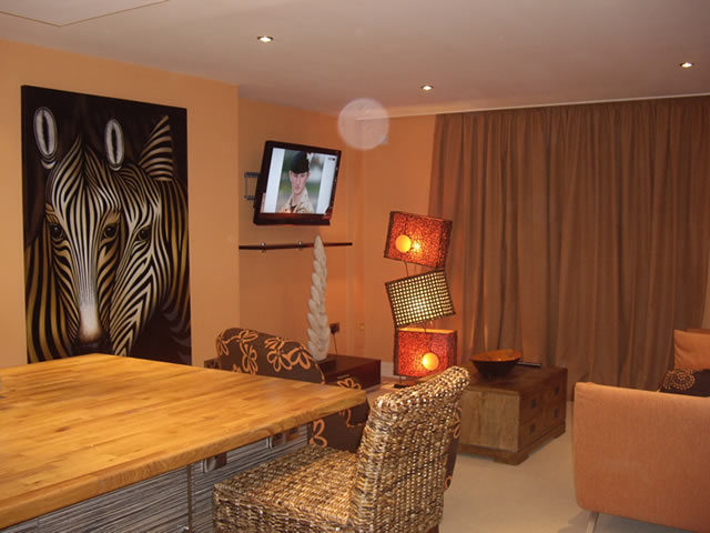 The Battledown Suite ( 535 sq ft) is a contemporary light one bedroom apartment with a fun African theme. There is a marble wet room, fully equiped kitchen with flat screen TV's in the lounge and bedroom. This bright and spacious apartment makes an ideal base to explore Cheltenham and the surrounding Cotswolds. Located on the lower ground floor.