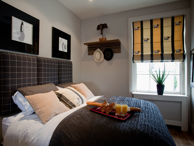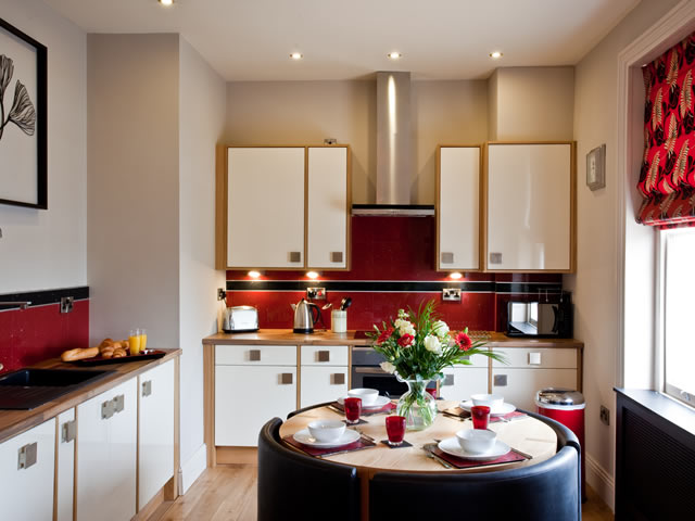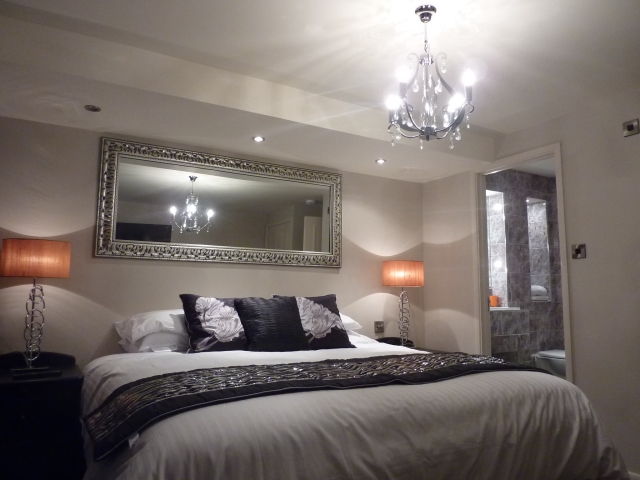 This luxurious first floor suite features a grand drawing room / open plan kitchen with 3 floor to ceiling sash windows. High quality designer decor and furnishings give a truly opulent feel to the apartment. There is a large lounge area featuring a flat-screen TV with DVD player and an open-plan kitchen with dining table. The stylish bathroom has a bath with monsoon shower over. The bedroom features a super king-size bed with luxurious bed linen.