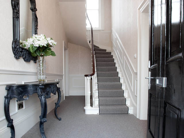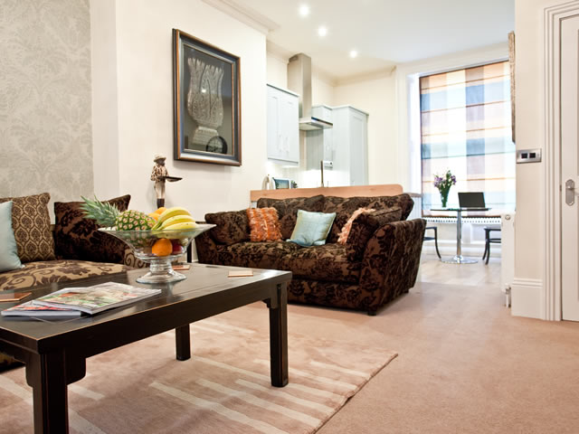This luxurious ground floor suite features a grand drawing room / open plan kitchen with 3 floor to ceiling sash windows,balcony overlooking garden. High quality designer decor and furnishings give a truly opulent feel to the apartment. There is a large lounge area featuring a flat-screen TV with DVD player and an open-plan kitchen with dining table. The stylish bathroom has a bath with monsoon shower over. The bedroom features a super king-size bed with luxurious bed linen.